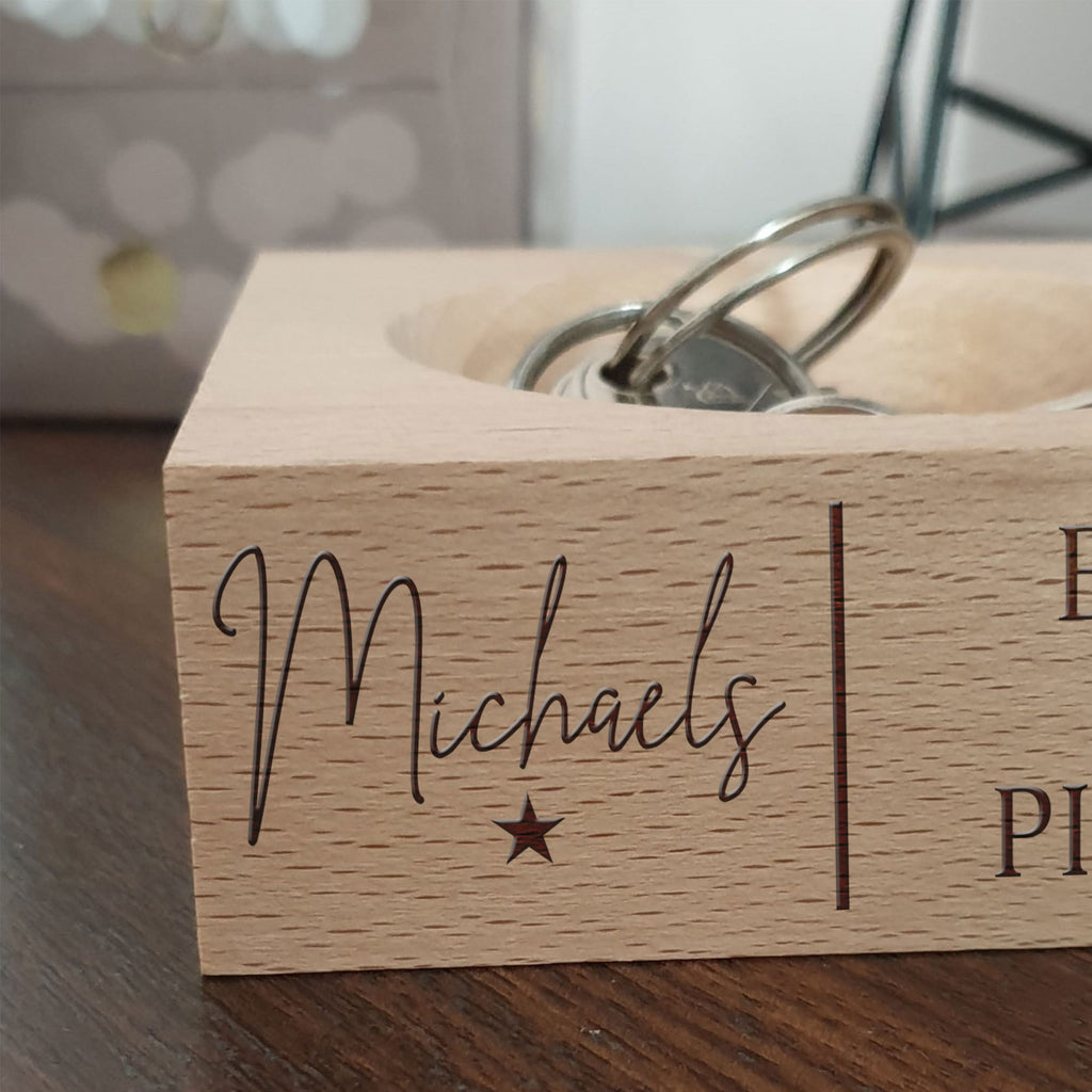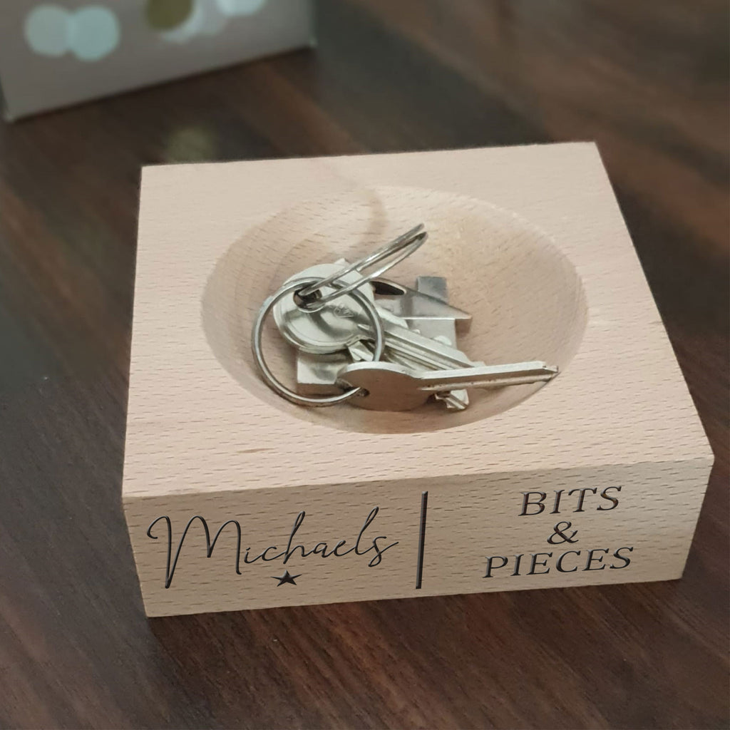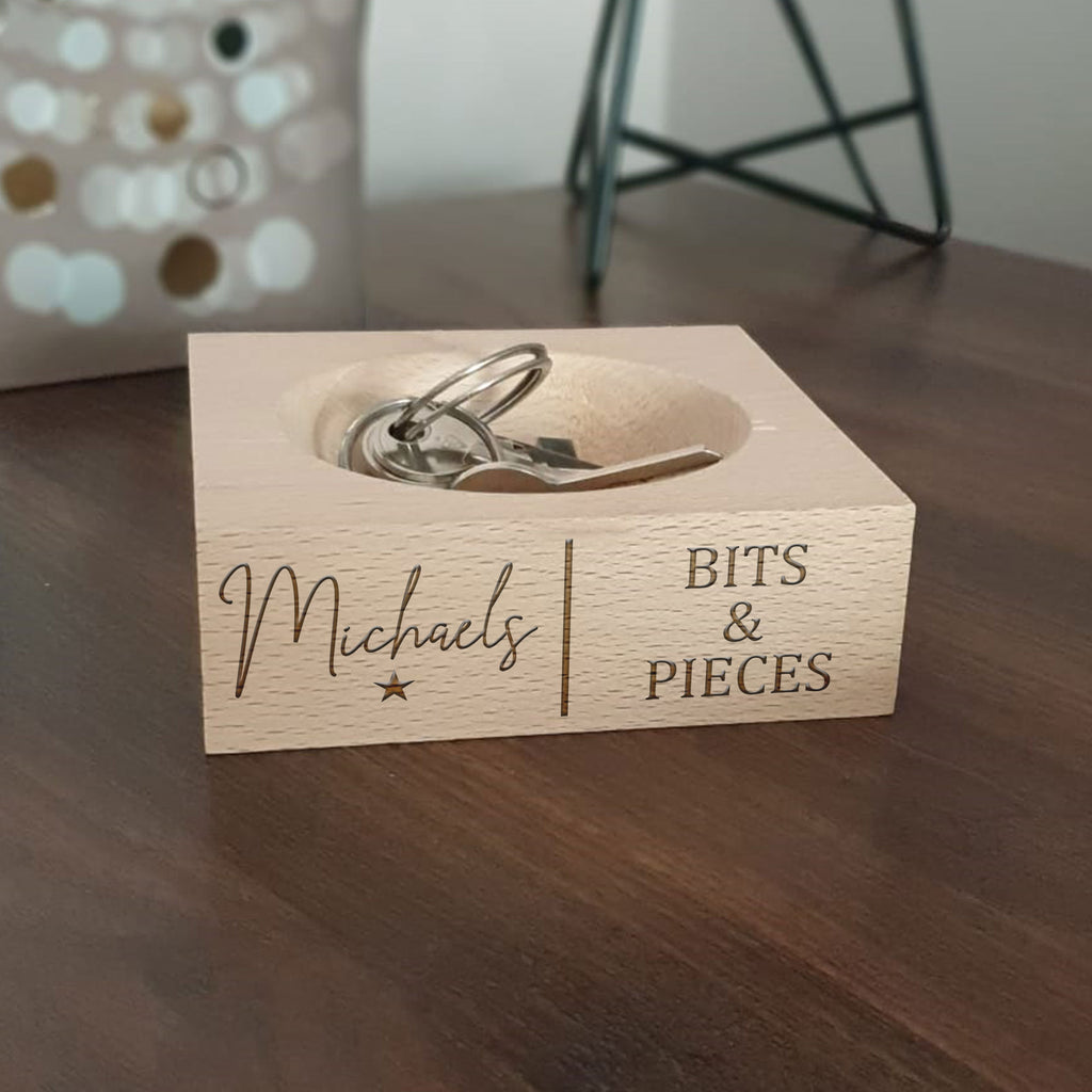 A great way to keep your loose change on a bedside table or maybe your keys for safe keeping, this solid beech tidy has a variety of uses and comes engraved with any name of your choice. On the right side are the words Bits & Pieces but this can be changed to something similar e.g. Bits & Bobs.